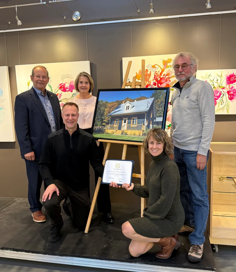 Photo, rangée du bas: M. Martin Lafrance, propriétaire de la maison Claude-Huot 2024 située au 240, chemin du Lac-Sept-Îles Sud et Mme Nathalie Desmeules, qui a participé au projet de restauration. Ils sont accompagnés de M. Claude Duplain, maire de la Ville de Saint-Raymond et de Mme Christiane Huot et M. Martial Moisan, membres de la Société du patrimoine de Saint-Raymond.