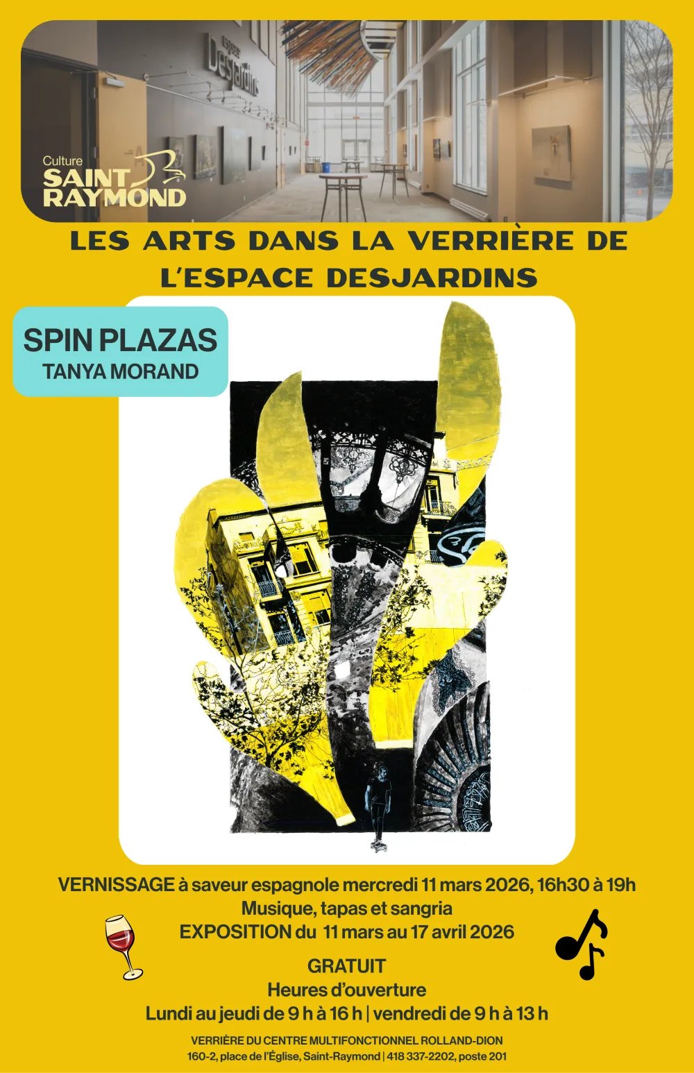 Culture Saint-Raymond accueillera du 18 mars au 17 avril 2026 l’exposition intitulée «SPIN PLAZAS » de l’artiste Tanya Morand dans la verrière de l’espace Desjardins du centre multifonctionnel Rolland-Dion. Le vernissage de l’exposition se déroulera le mercredi 18 mars, entre 16h30 et 19h. L’événement, aux couleurs de l’Espagne, sera agrémenté de musique, tapas et sangria. L’entrée est gratuite et toute la population est invitée à y prendre part. Soyez-y!