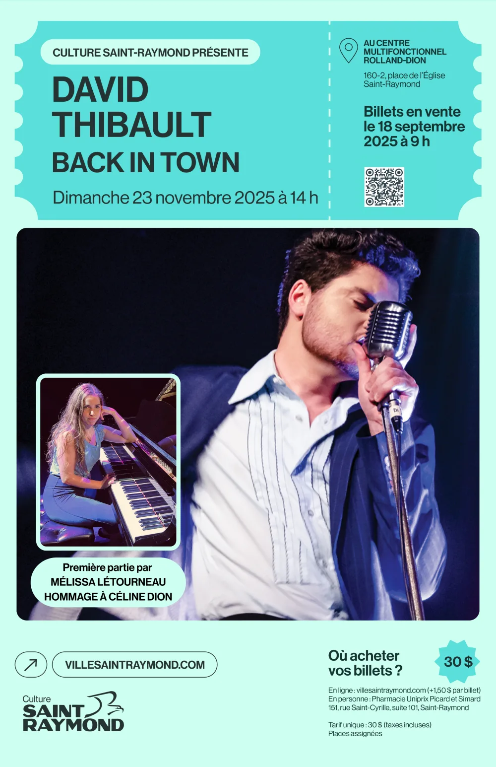 Culture Saint-Raymond présentera le spectacle de l’artiste David Thibault au centre multifonctionnel Rolland-Dion, le dimanche 23 novembre 2025 à 14 heures. L’ouverture des portes aura lieu à 13h30. Il s’agit d’un spectacle avec entracte et dont la première partie sera assurée par la chanteuse Mélissa Létourneau.