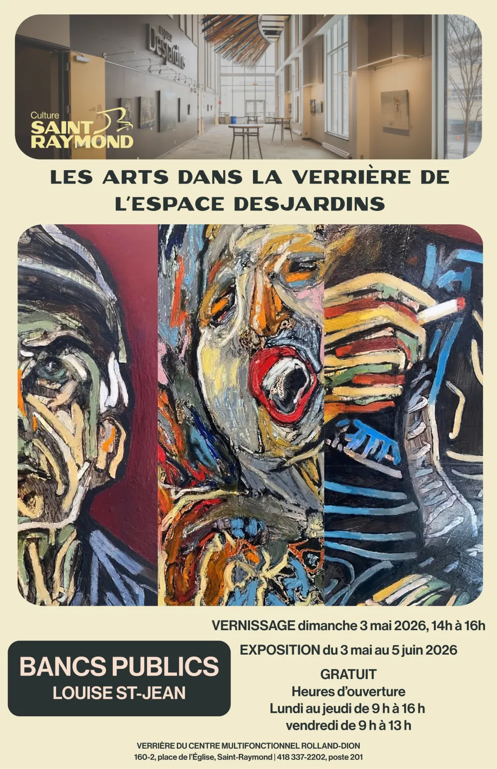 Culture Saint-Raymond accueillera du 3 mai au 5 juin l’exposition intitulée «BANCS PUBLICS » de l’artiste Louise St-Jean dans la verrière de l’espace Desjardins du centre multifonctionnel Rolland-Dion. Le vernissage de l’exposition se déroulera le dimanche 3 mai, entre 14h et 16h. L’entrée est gratuite et toute la population est invitée à y prendre part.