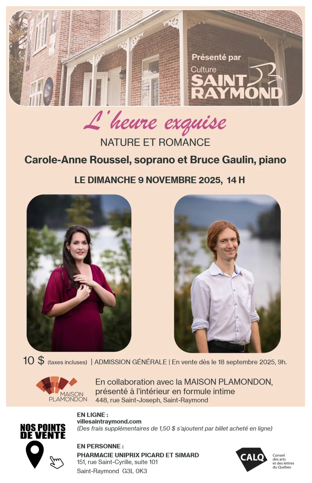 Culture Saint-Raymond présentera le récital de la chanteuse lyrique soprano Carole-Anne Roussel accompagnée au piano par Bruce Gaulin. Le spectacle se tiendra le dimanche 9 novembre 2025 à 14 heures à la Maison Plamondon. D’une durée d’environ 60 minutes, le concert sera présenté sans entracte. Les billets sont au coût de 10 $ et l’admission est générale. La présentation de ce spectacle est rendue possible grâce à la participation financière du Conseil des arts et des lettres du Québec.