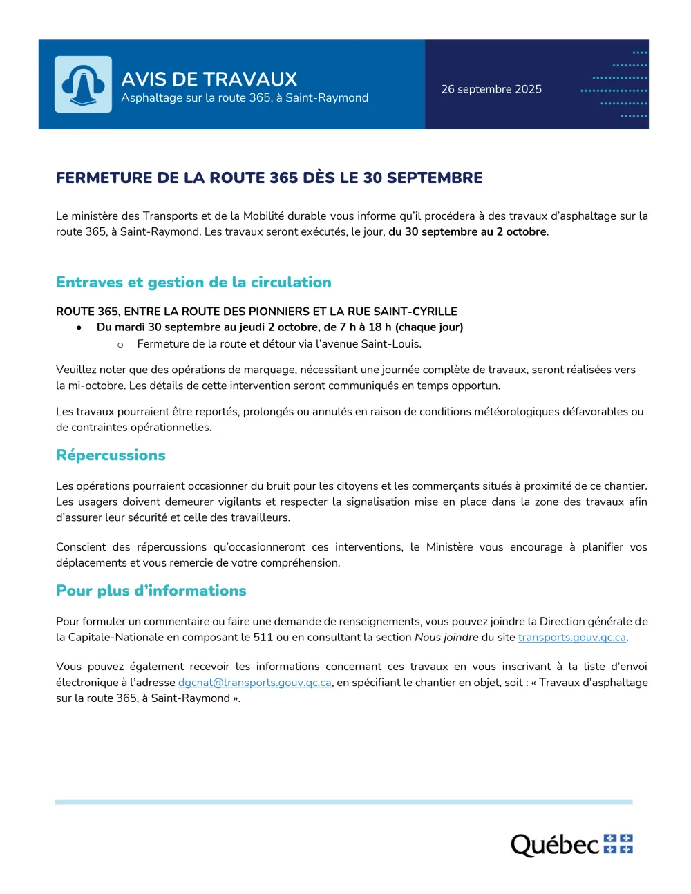 Comme mentionné lors d’un avis précédent, le chantier de forage sur côte Joyeuse se terminera avec des travaux d’asphaltage. Le ministère des Transports et de la Mobilité durable nous informe que ces travaux sont prévus :