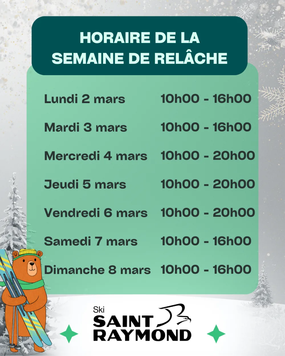 En plus de l'horaire régulier, la station est ouverte lors des CONGÉS SCOLAIRES INCLUANT LA SEMAINE DE RELÂCHE du centre de services scolaire de Portneuf, pour le ski, la planche à neige et la glissade.